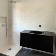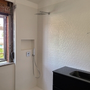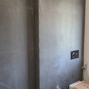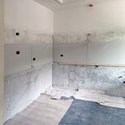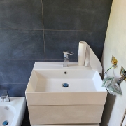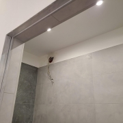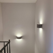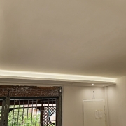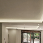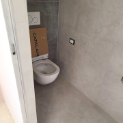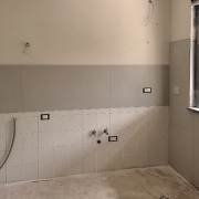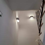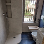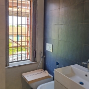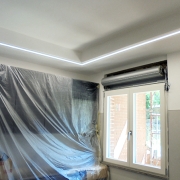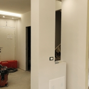 In questa ristrutturazione c'è stata una modifica degli spazi interni e uno spostamento della porta di ingresso con relativo taglio del muro. Studio per l'ottimizzazione dei vani per realizzare spazi sufficienti dove sistemare le proprie cose (armadi a muro, soppalchi). Il lavoro ha riguardato inoltre il rifacimento di tutti gli impianti di condizionamento, elettrici, idraulici con l'aggiunta di un piccolo bagno al piano terra con porta scorrevole per ottimizzare gli spazi e renderli più luminosi e fluidi, zone multifunzionali nelle camere dove poter anche lavorare. Controsoffittatura così come richiesta dal cliente per l'inserimento delle luci, posa in opera e fornitura del parquet per il soggiorno collegato direttamente alla cucina tramite una grossa apertura con vetrata scorrevole, sostituzione degli infissi.