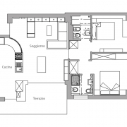 In questo tipo di progetto il cliente aveva necessità di realizzare l'intero spazio ex novo. La cucina si apre alla zona living filtrandola con opportune schermature dalla piccola area che interessa l'entrata, mentre la parete viene trattata con mattoncini in cotto a contrasto delle superfici levigate presenti.