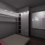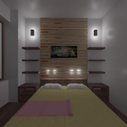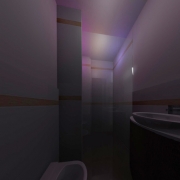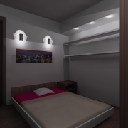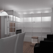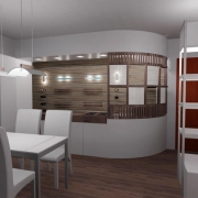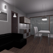 La zona tv viene idealmente divisa dalla zona pranzo mentre arredi minimalisti ed allo stesso tempo eleganti si legano ai colori del pavimento in parquet. I mobili della casa e le lampade sopra il tavolo della zona pranzo sono stati progettati dal nostro studio in collaborazione con il proprio falegname di fiducia. Nel bagno più grande, anche se sempre di dimensioni ridotte è stato ricavato un ampio spazio doccia con luci per la cromoterapia.