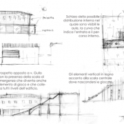 La scuola diventa il fulcro del nostro futuro, immagine, e non solo, dei nostri più fecondi ideali che si realizzano nel tempo e crescono in un continuo scambio, oltre che di sapere e conoscenza, anche di vita vissuta. L'idea che abbiamo sviluppato è quella di un ambiente che si libera da uno schema tipologico rigido dove gli spazi diventano comunicanti e la separazione tra aula e corridoio tende a scomparire. L'edificio si divide in due blocchi funzionali ma progettualmente uniti; da una parte un blocco squadrato nel quale sono inseriti i servizi (palestra, mensa), dall'altra una linea serpentina (aspetto ludico) che definisce gli spazi delle aule. Una diversità rimarcata anche dall'uso dei materiali, rivestimento in travertino per la parte servizi e mattoni per la curva. Molti sono gli elementi che spiccano nel progetto: il corridoio con la doppia altezza nel quale ognuno si fa partecipe del luogo in uno scambio continuo di informazioni e gioco, la scala interna con struttura in legno, il sottoscala che diventa elemento ludico, i pluviali trasparenti interni a vista che incanalano l'acqua per essere riutilizzata, in modo tale da rendere partecipi gli alunni dell'importanza dell'uso degli elementi naturali, il fotovoltaico sulla palestra, il tetto giardino, i materiali esterni naturali e resistenti che si adattano alle caratteristiche del luogo e garantiscono qualità e durabilità nel tempo. Abbiamo voluto progettare un edificio nel quale la scuola non assume più l'aspetto di una istituzione calata dall'alto quasi a voler disciplinare i cittadini ma si immerge nelle loro vite subendone le trasformazioni.